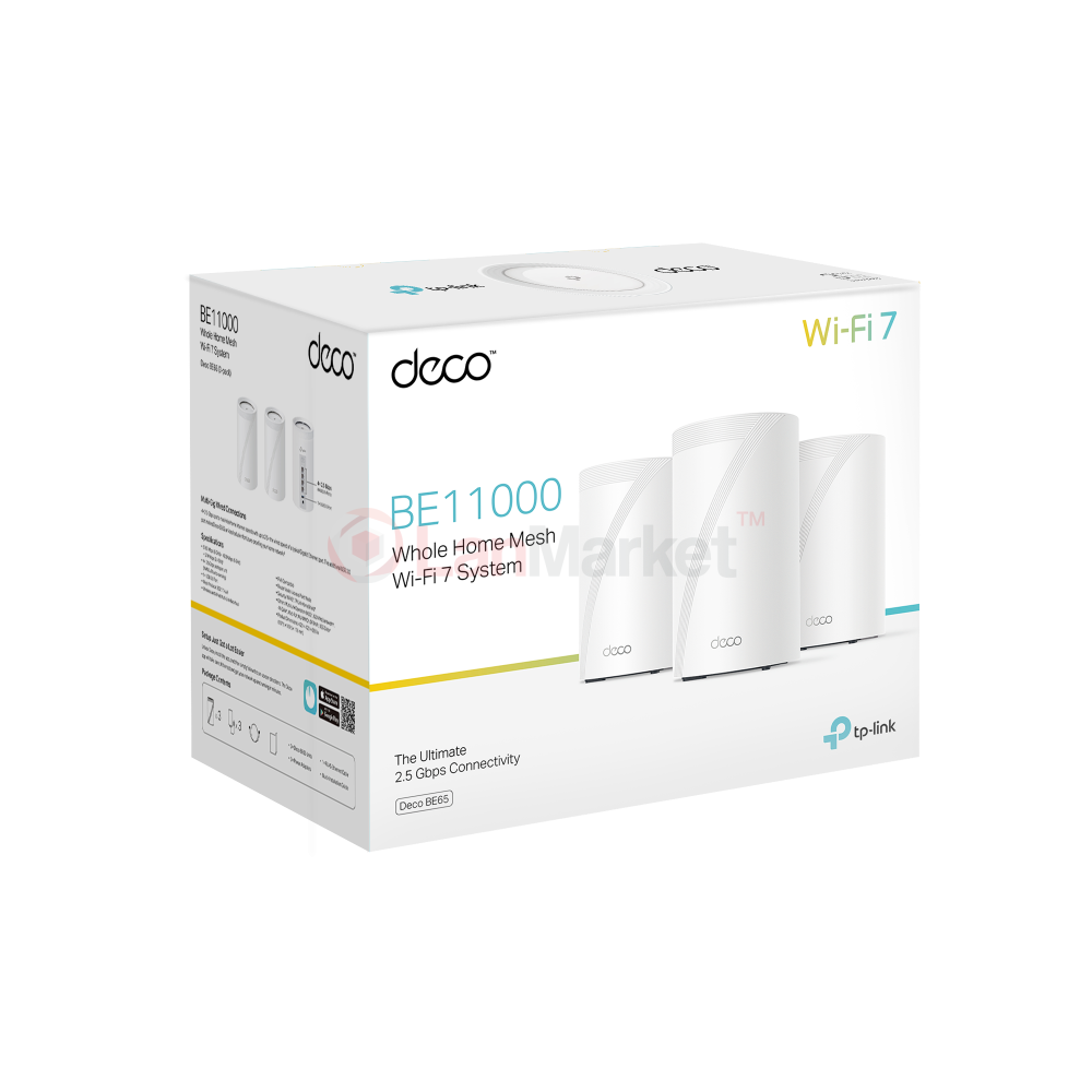 Deco BE65 — трёхдиапазонная Mesh-система класса BE11000 с поддержкой Wi-Fi 7, предназначенная для построения высокоскоростной сети с мультигигабитной пропускной способностью и стабильным покрытием в больших помещениях.