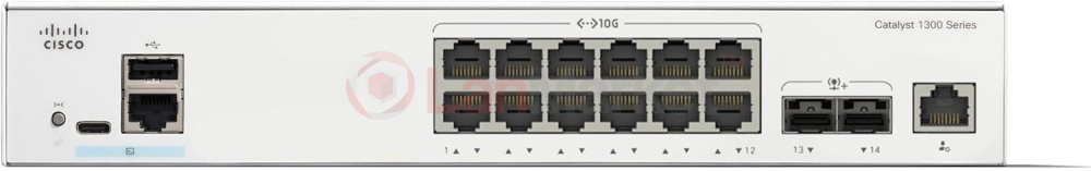 Cisco C1300-12XT-2X обладнаний 12 портами 10 Gigabit Ethernet для підключення високошвидкісних пристроїв і серверів, а також 2 портами SFP+, що дозволяють інтегрувати оптичні з’єднання для міжмережевих підключень або підключення до магістральних ліній. Для керування передбачено консольний порт RJ-45 Cisco і USB Type-C порт, який також використовується для передачі файлів і налаштування системи.