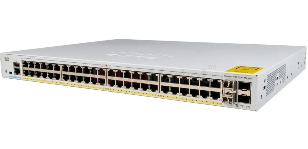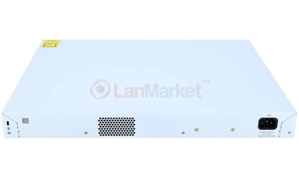 Модель Cisco C1000-48P-4G-L оснащена 48 портами Gigabit Ethernet (RJ-45) для підключення користувацьких пристроїв і 4 висхідними портами SFP для оптичних модулів, що забезпечують гнучкість мережевого підключення. Комутатор підтримує стандарт PoE+ із загальним бюджетом потужності 370 Вт, що дозволяє живити IP-телефони, точки доступу Wi-Fi або IP-камери без додаткових блоків живлення.