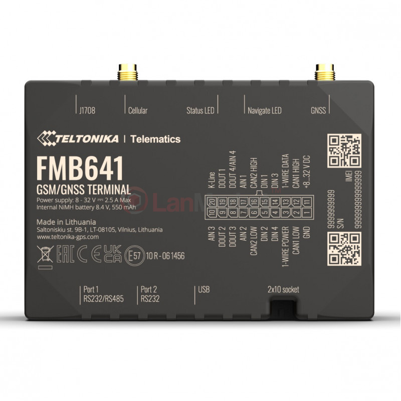 FMB641 оснащений вбудованим акселерометром для фіксації руху, падінь і нестандартних ситуацій, а також резервним акумулятором на 550 мА·год для автономної роботи у разі втрати основного живлення. Підтримка карт MicroSD дозволяє зберігати великі обсяги даних без втрат, а зовнішні GNSS та GSM антени забезпечують високу точність позиціонування. Оновлення прошивки та налаштування доступні дистанційно або через USB, що спрощує обслуговування великих автопарків і спеціалізованої техніки.