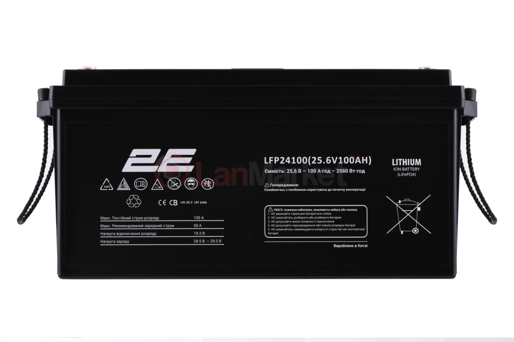 Модель має номінальну напругу 25,6 В і ємність 100 А•год, що гарантує стабільне живлення навіть при високих навантаженнях. Максимальний струм заряду становить 100 А, а номінальний струм — 20 А, що забезпечує оптимальний режим для збереження ресурсу елементів. Ступінь захисту IP56 дозволяє експлуатувати батарею у умовах підвищеної вологості та пилу. Термінали М8 забезпечують надійне та просте підключення.