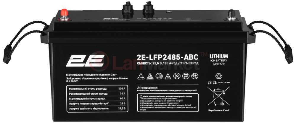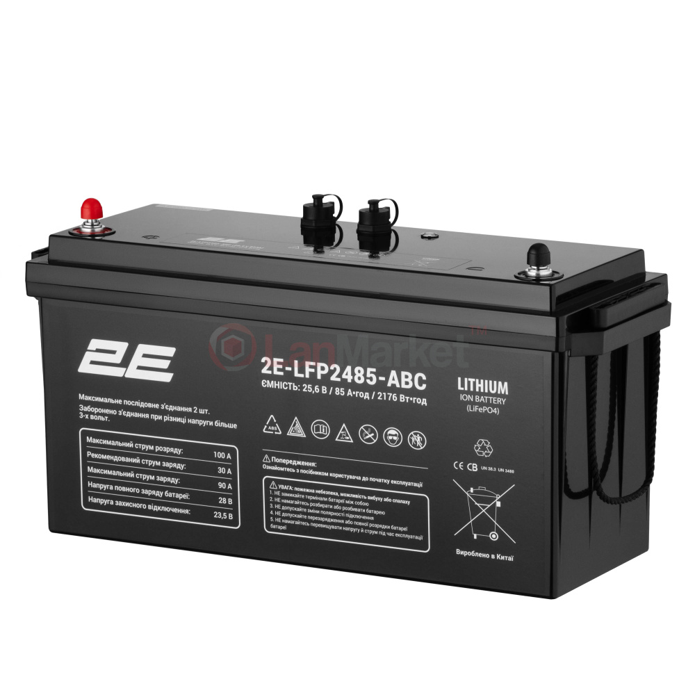 Батарея має номінальну напругу 25,6 В і ємність 85 А·год (при розряді 0,2C до 22,5 В за температури 25°C), що забезпечує стабільне живлення навіть у тривалих циклах. Робочий діапазон напруги становить 22,5–28,0 В, а ресурс перевищує 4000 циклів при розряді 1С або понад 6000 циклів при навантаженні 0,25С. Підтримуються паралельні підключення до 4 батарей та послідовне з’єднання 2S (51,2 В). Максимальний струм заряджання сягає 90 А, номінальний — 30 А, а імпульсний струм розряду — до 130 А протягом 2 секунд. Керування та контроль параметрів забезпечує інтегрована система BMS. Модель має ступінь захисту IP35 і використовує термінали М8 для надійного підключення.