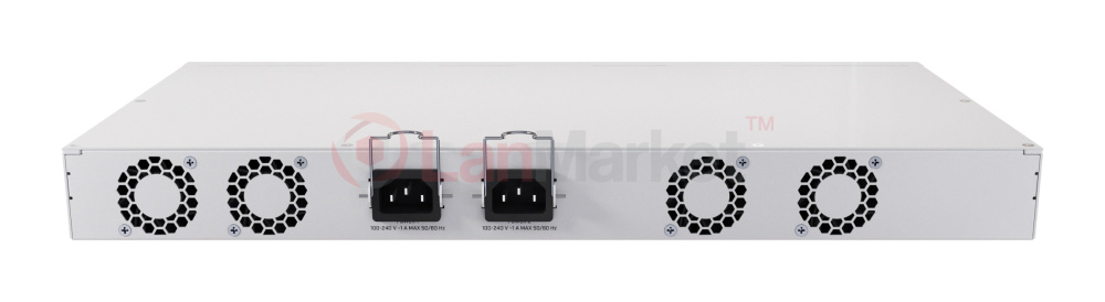 Є два незалежні AC входи 100–240 В для резервування живлення. PoE-out відповідає стандарту 802.3af/at, загальна потужність 150 Вт (до 1,1 А на порт при <30 В та 0,56 А при >30 В). Максимальне споживання – 215 Вт (без навантаження – 28 Вт). Габарити: 443 × 230 × 44 мм.