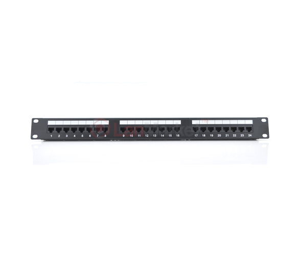 Патч-панель має 24 порти RJ-45 і відповідає категорії 5E, забезпечуючи стабільну передачу даних. Вона є неекранованою (UTP) і виготовлена з металу чорного кольору. Панель розрахована на монтаж у стандартні 19-дюймові стійки або шафи висотою 1U.