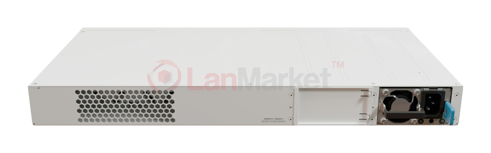 Сам коммутатор снабжается надежным блоком питания мощностью 600 Вт, но Mikrotik также зарезервировал слот расширения для дополнительного блока питания на случай, если вам потребуется увеличить выходную мощность до 1150 Вт. Для этого выпущен специальный блок питания G1483-0600WNB – 54,5 В 10,35 А 600 Вт. В комплекте входит блок питания с возможностью горячей замены.
