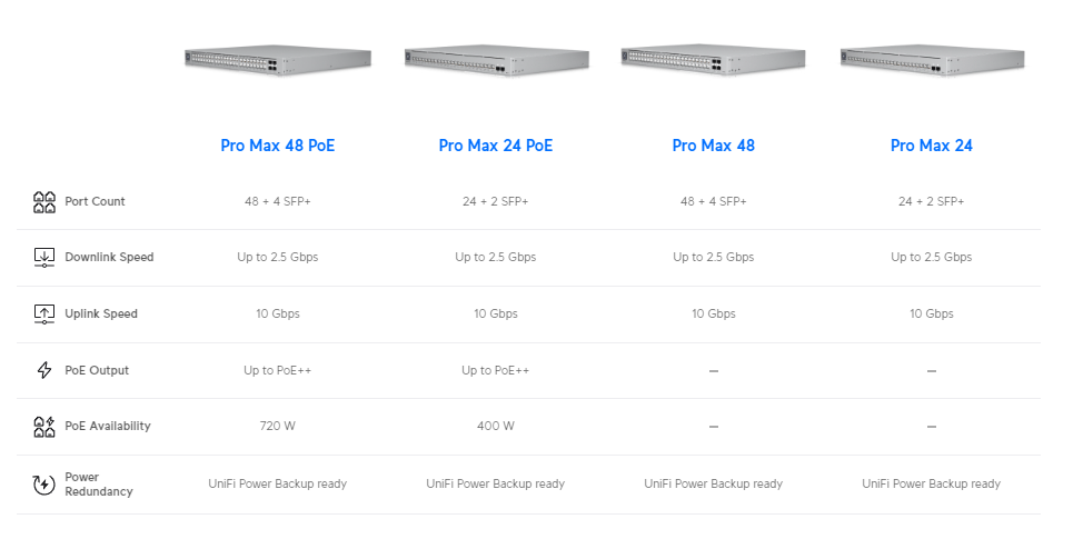 Разом з Unifi 7 анонсовано нову серію комутаторів Pro Max, яка складатеметься з моделей: