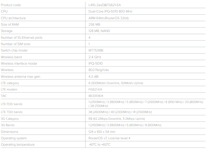 Розроблений з урахуванням ваших потреб, hAP axe lite LTE6 може також похвалитися чотирма портами Gigabit Ethernet, швидкісним двоядерним процесором ARM і 256 МБ оперативної пам’яті, що робить його ідеальним вибором для невеликих офісів і домашніх мереж. MikroTik також інтегрував новітню бездротову технологію 2,4 ГГц Gen6 (802.11ax), а також надійну двохканальну антену 4,3 дБі.
