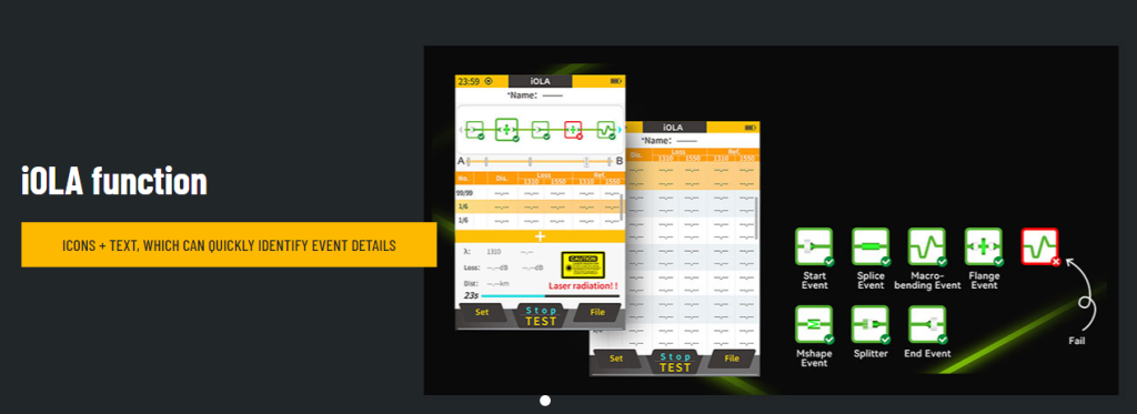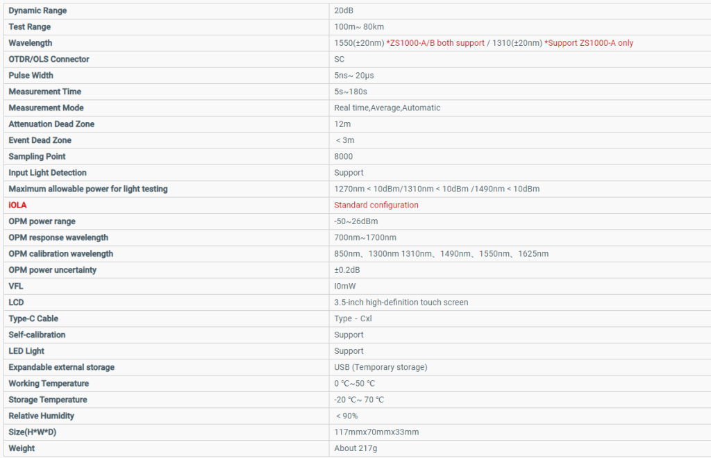OTDR ZS1000-A Signal Fire має п’ять функцій: OTDR, iOLA, оптичний вимірювач потужності, стабільне джерело світла, джерело червоного світла, світлодіодний ліхтарик. Динамічний діапазон становить 20 дБ, тестова відстань становить 100-80 км, мертва зона затухання 12 м, а мертва зона події менше 3 м. Він має 3,5-дюймовий повнокольоровий сенсорний екран високої чіткості, літієву батарею на 2000 мАг і компактний, але потужний корпус.