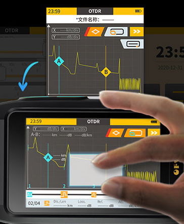3,5-дюймовий сенсорний екран високої чіткості, дизайн роботи мобільного телефону, підтримка мультитач, підтримка горизонтального дисплея, більш чіткий перегляд кривої OTDR. РК-дисплей високої роздільної здатності, навіть при сильному сонячному світлі користувач може легко та чітко користуватися пристроєм.