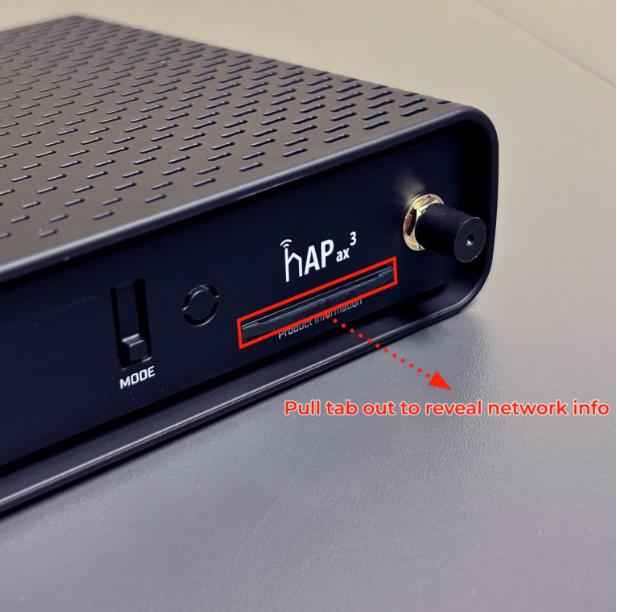 Якщо ви щойно придбали новий MikroTik hAP AX3 чи LHGG LTE18, можливо, вам цікаво, де зберігаються найважливіші дані мережі за замовчуванням. Зазвичай на цих типах пристроїв на задній або нижній стороні обладнання є ярлик, який відображає ваше ім’я для входу, пароль, ідентифікатор мережі за замовчуванням тощо. Такий ярлик є на вищевказаних пристроях, але він не в звичайному місці, де можна було б подумати шукати – вони обидва мають «приховану» вкладку на задній панелі пристрою. Біля цієї прихованої вкладки є слова «Product Information» — користувачі повинні обережно схопити вкладку та потягнути назовні, щоб відкрити вміст. Нижче ви можете побачити приклад hAP AX3: