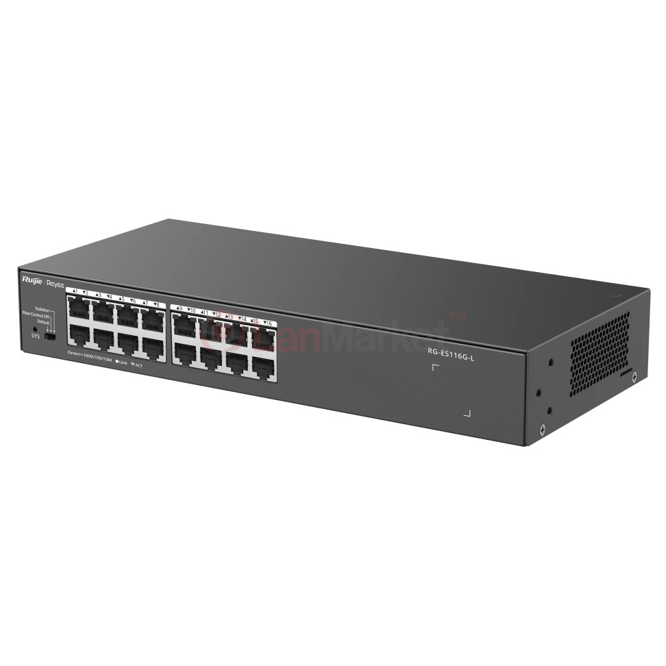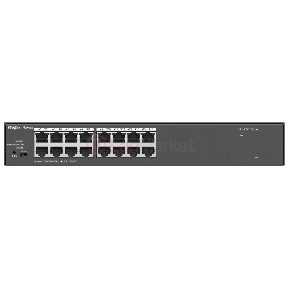 RG-ES116G-L оснащен 16 портами 10/100/1000M RJ45, что обеспечивает гигабитную скорость для всех подключений. Коммутатор демонстрирует поразительную пропускную способность 32 Gbps и пакетную производительность 23.81 Mpps, гарантируя эффективную работу сети даже при высоких нагрузках. Размер таблицы MAC адресов составляет 8К, что обеспечивает поддержку достаточного количества уникальных устройств в сети.