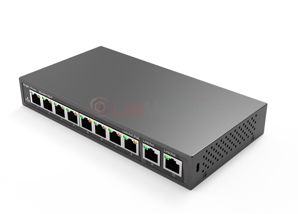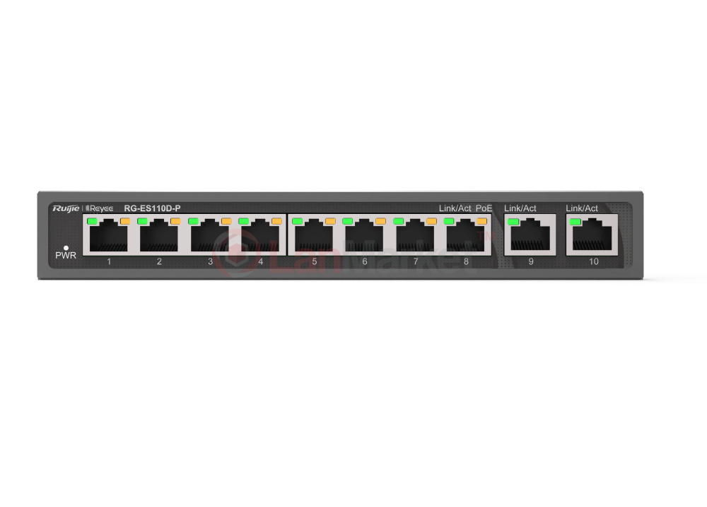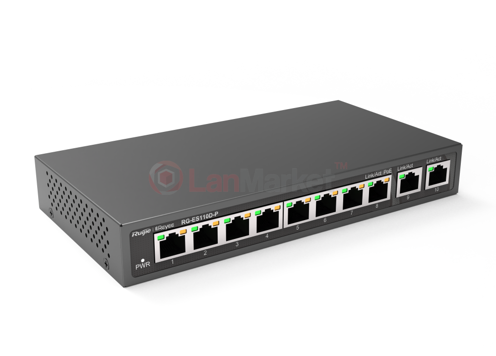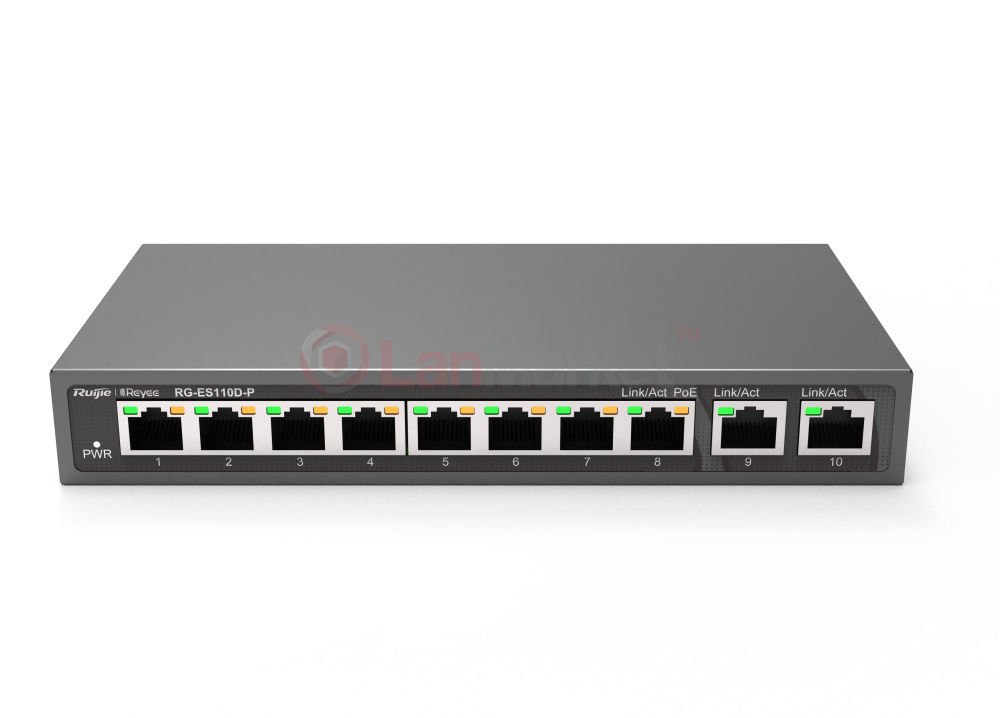 RG-ES110D-P - 10-ти портовая модель, которая имеет 8 x 10/100BASE-TX Downlink порты и 2 x 10/100/1000BASE-T Uplink. Первые 8 поддерживают PoE/PoE+, и имеют общий бюджет 110W.