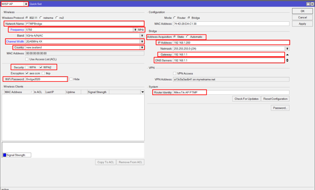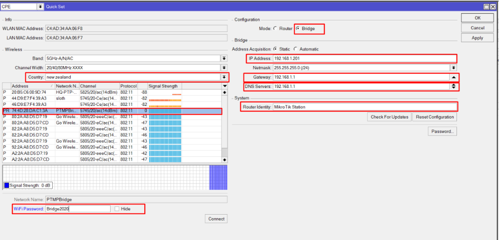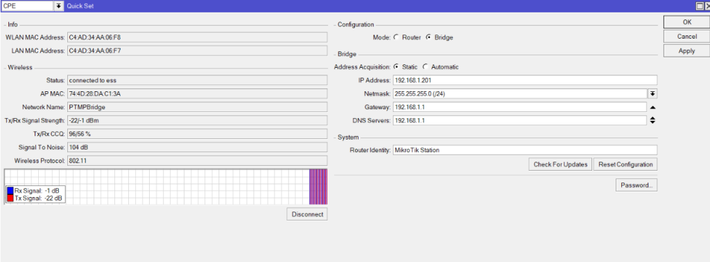 Дані інструкції зроблено для того, щоб якнайшвидше запустити ваше з’єднання PTMP без будь-яких додаткових налаштувань, використовуючи статичні IP-адреси для радіостанцій. mANTBox 15s використовується як базова станція, вона постачається з ліцензією рівня 4, відповідно він може діяти як точка доступу для кількох клієнтських радіостанцій. SXTsq 5ac (RBSXTsqG-5acD) використовується в нашому випадку як клієнтська радіостанція CPE, цей пристрій постачається лише з ліцензією CPE/Level 3, однак її також можна використовувати для посилань PTP. (Не можна використовувати як базову станцію на PTMP, оскільки потрібна ліцензія рівня 4).