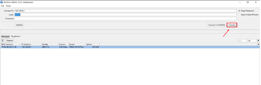 Після запуску Winbox у списку сусідів ви повинні побачити Mac-адресу та IP-адресу Mikrotik Radio.