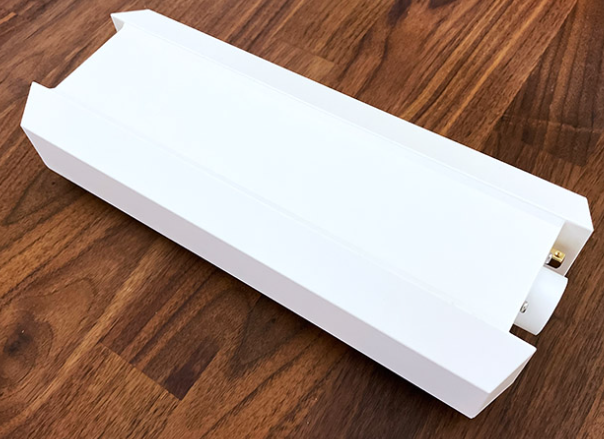 Пристрій повністю виготовлено з пластику і має вузьке прямокутне шасі, що характерно для такого типу точок доступу. У нижній частині TP-Link EAP610-Outdoor є круглий отвір, куди можна вставити кабель Ethernet, і жодних інших отворів навколо корпусу немає.