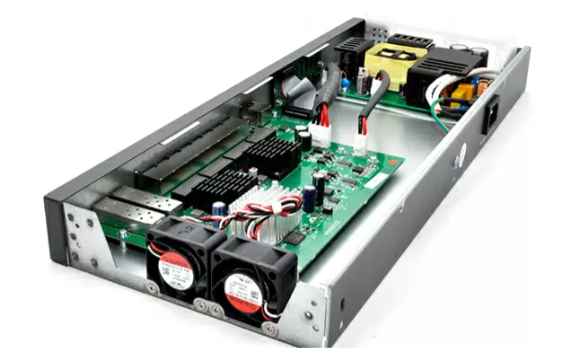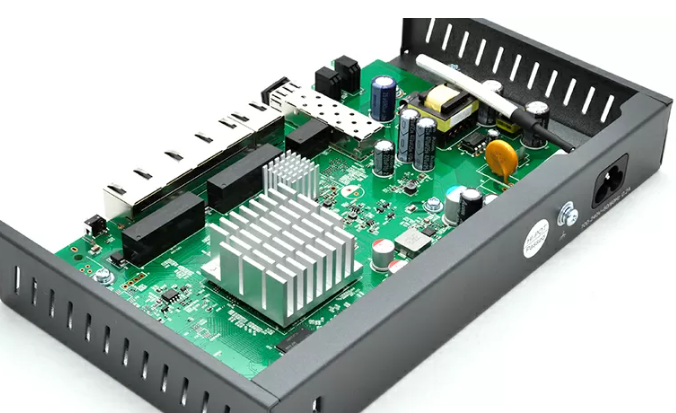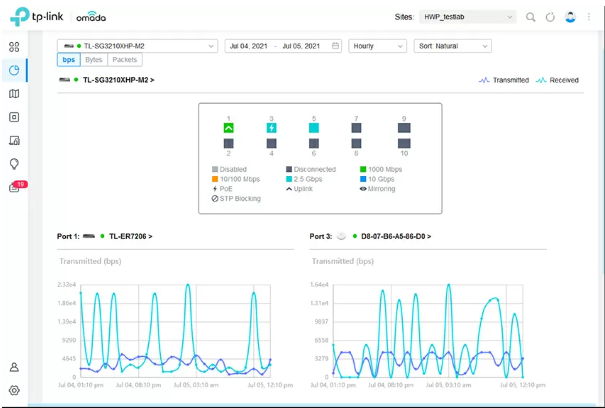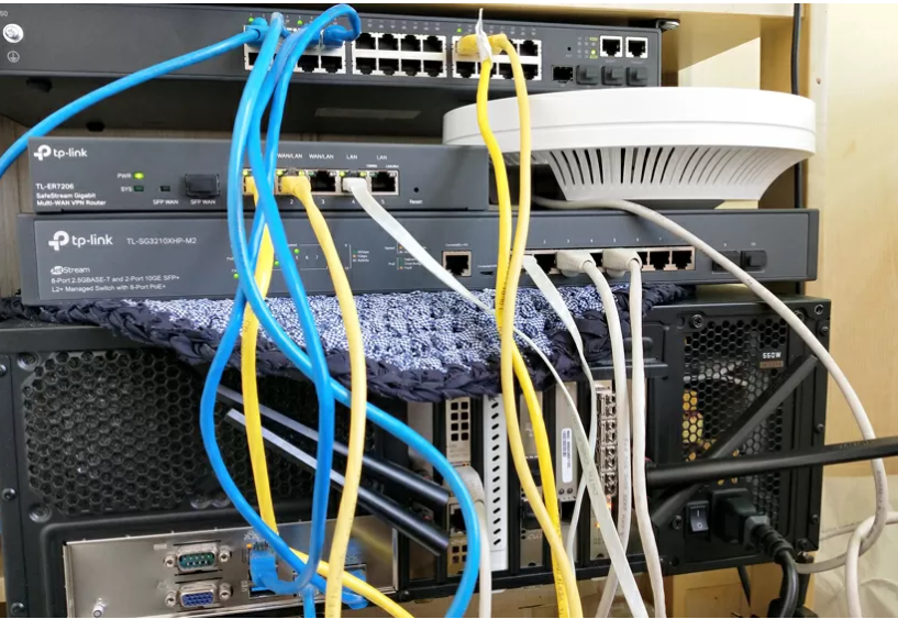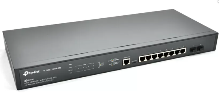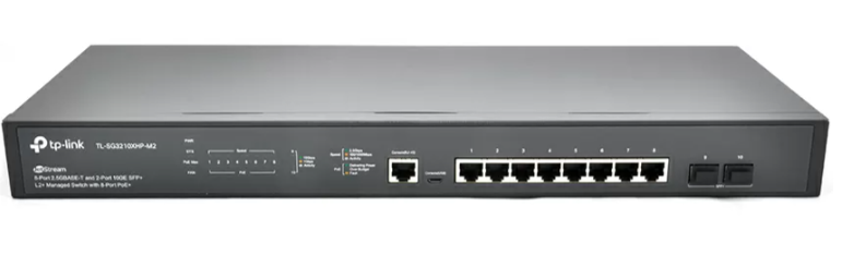 Ми використовували комутатор TL-SG3210XHP-M2 PoE, який спеціально розроблений для розгортання в середовищах Wi-Fi 6. Він має два 10-гігабітних SFP порти як аплінк, а розподільна частина — 8 портів PoE+ RJ45 зі швидкістю 2,5 Гбіт/с. Загальний бюджет PoE оцінюється в 240 Вт, сам комутатор споживає 17 Вт. Пристрій охолоджується двома вентиляторами, тому працює досить голосно навіть без підключеного навантаження PoE, тому монтувати TL-SG3210XHP-M2 потрібно в окремій кімнаті або звукоізоляційній шафі. Матриця комутації становить 80 Гбіт/с, що дорівнює сумі швидкостей всіх портів в дуплексному режимі.