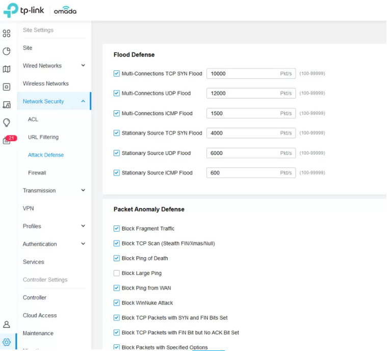 Для захисту від DDoS-атак за допомогою методу переповнення буфера існує антифлуд для TCP, UDP і ICMP.