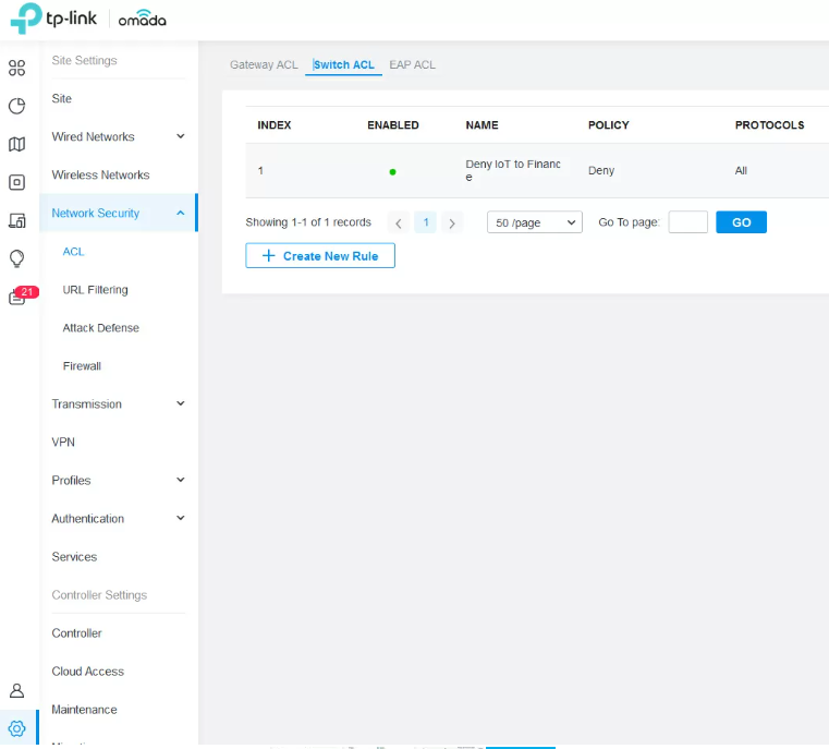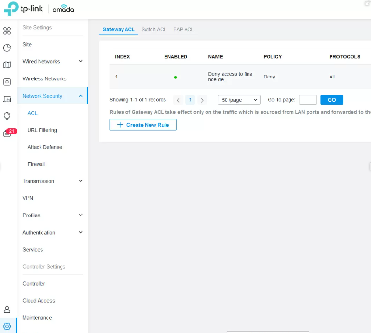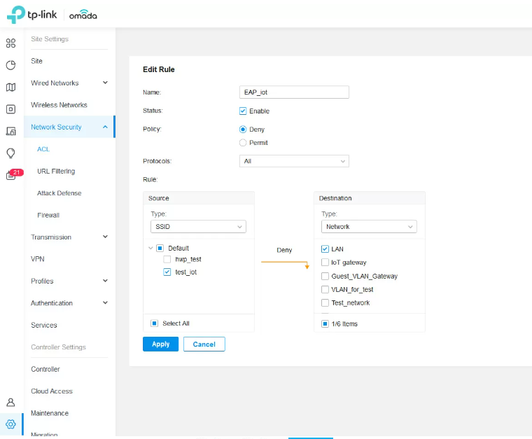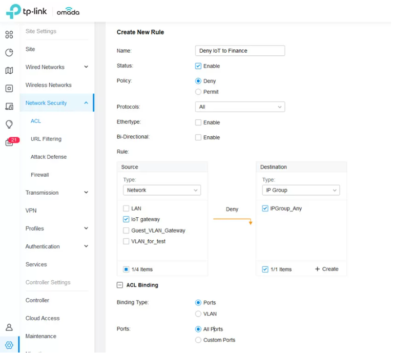 Параметри безпеки представлені правилами для ACL списків, реалізованих на шлюзі доступу, комутаторі або точці доступу. Якщо ви хочете заблокувати пристроям доступ до вказаних підмереж, залишивши лише доступ до Інтернету, тоді вам сюди. Цікаво, що ACL налаштовується окремо для точок доступу, комутаторів і шлюзів, але принцип всюди однаковий: ви вказуєте, яку підмережу заборонити або дозволити доступ до якого діапазону IP, ну, плюс на комутаторі цю прив'язку можна зробити до VLAN або портів.