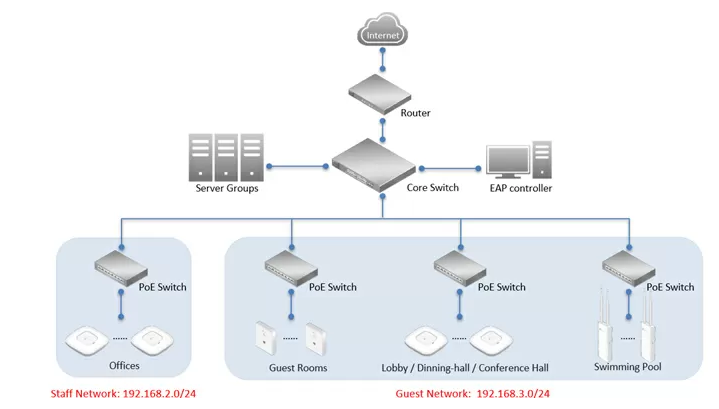 Сьогодні системи керування мережами можуть значно полегшити управління ІТ-інфраструктурою навіть на невеликих об’єктах, не кажучи вже про великі розподілені установки з філіями в різних частинах світу. Погодьтеся: сисадмін душу продасть за можливість одним натисканням кнопки налаштувати VPN-тунель між двома офісами, і це лише крапля в морі — один із тих моментів, які спрощують, здешевлюють і роблять вашу мережу більш гнучкою. На діаграмі нижче показано звичайний сценарій розгортання мережі в готельному комплексі: тут автентифікація використовується через портал для внутрішньої бездротової мережі плюс гостьова мережа, розподілена в кількох кімнатах або навіть будівлях. Без використання загального контролера було б неможливо організувати роботу в гостьовій мережі з підтримкою 802.11 k/r.