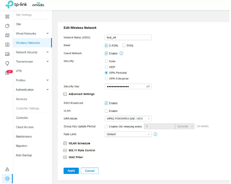 Наступним кроком буде налаштування бездротової мережі на точці доступу EAP660HD. Ми створимо дві мережі: одна спільна, з відкритим SSID в діапазонах 2,5 і 5 ГГц. Оскільки наша точка доступу підтримує Wi-Fi 6 (і не просто підтримує, а має 8 просторових потоків і 2,5-гігабітне підключення), для безпеки ми вже включимо стандарт WPA3, залишивши сумісність з WPA2. Хочу зауважити, що такі параметри, як Band Steering, роумінг або підтримка MESH, зазвичай задаються в налаштуваннях сайту і діють глобально на весь бездротовий простір.