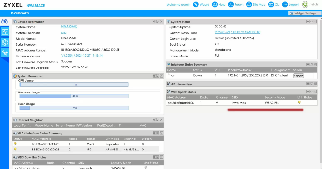 Zyxel NWA55AXE може працювати в автономному режимі, налаштовуючись вручну через традиційний веб-інтерфейс.