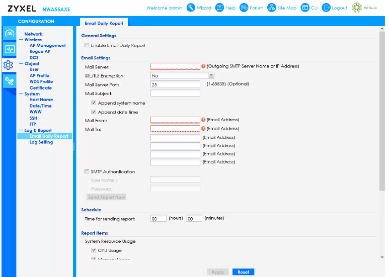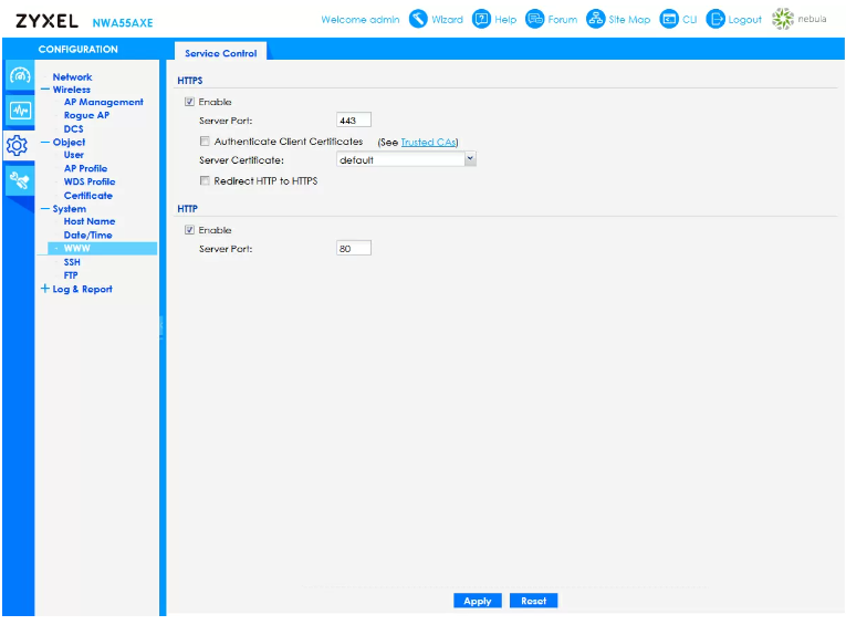 Усі нові точки доступу Zyxel підтримують керування хмарним контролером Zyxel Nebula Control Center, який реалізує функції безперебійного роумінгу, побудови Mesh-мереж, а також зручного моніторингу та налаштування великої кількості пристроїв. Останнім часом тут з'явилися функції обмеження мінімальної швидкості для обох діапазонів частот, а також вибір щільності розміщення ТД, що автоматично змінює потужність передавачів.