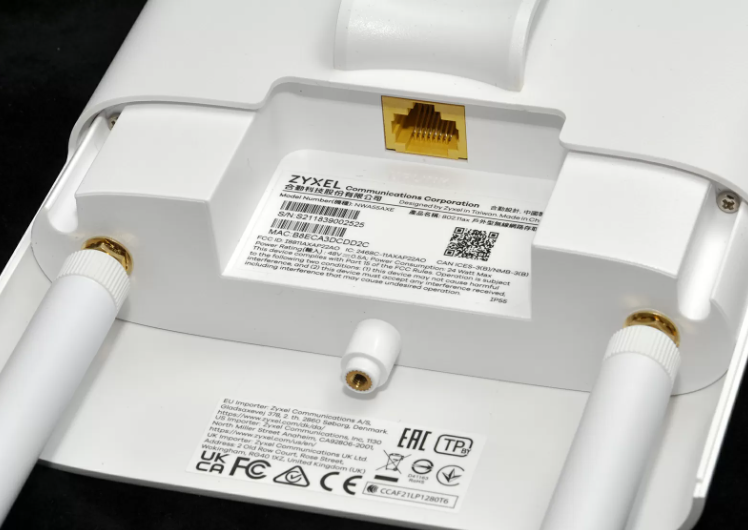 При настінному монтажі слід мати на увазі, що значна частина випромінювання від NWA55AXE буде проходити через стіну в кімнату. Це можна використати на вашу користь під час побудови Mesh-мереж або в деяких випадках взагалі обійтися без внутрішньої точки доступу. Судячи з конструкції, антени тут звичайні, дротові. Вони мають посилення 4 дБі в діапазоні 2,4 ГГц і 5 дБі в діапазоні 5 ГГц. У разі облаштування бездротового моста для передачі на великі відстані має сенс замінити антени на спрямовані.