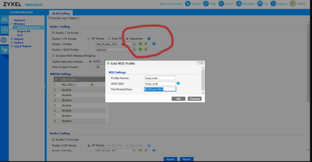 Після включення режиму Root AP на першому TD переходимо в веб-інтерфейс NWA55AXE і включаємо режим Repeater в тому ж частотному діапазоні, після чого в налаштуваннях WDS вказуємо SSID і пароль, встановлений для backhaul каналу на root hotspot. . Тут слід мати на увазі, що якщо обидва і т. д. підключені до одного комутатора, то на slave може утворитися шлейф, але при використанні керованих комутаторів це не страшно: порт буде відключений протоколом STP, і ви зможете отримати доступ до інтерфейсу TD через Wi-Fi. Фактично, на цьому налаштування мосту закінчується, і ви можете створити окремі SSID на підпорядкованій точці доступу, щоб параметри безпеки не збігалися.