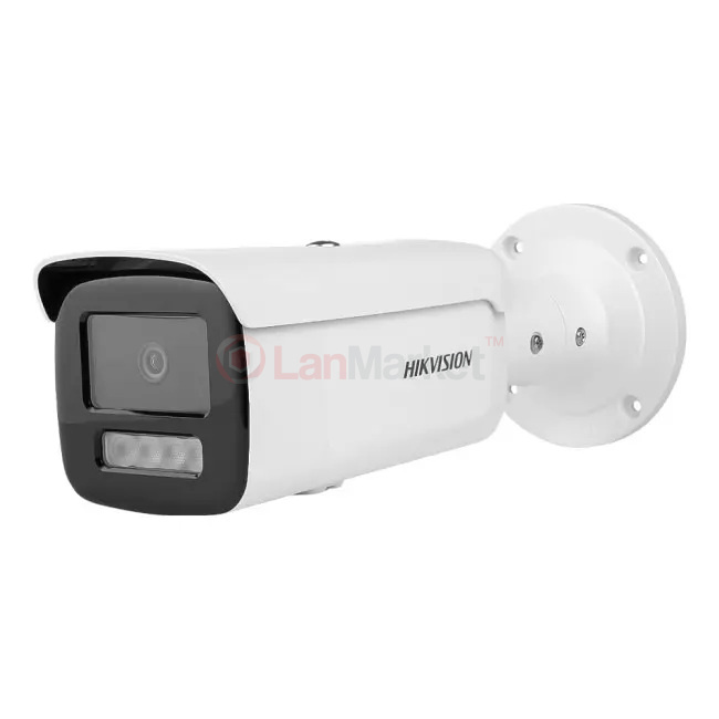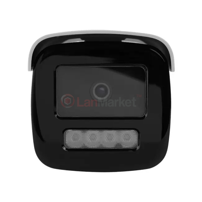 Hikvision DS-2CD2T43G2-4LI має витягнутий “bullet”-корпус, який одразу видно на фасаді. Він має акуратний вигляд, без зайвих деталей, з великим козирком спереду, що захищає об’єктив від дощу та прямих сонячних променів. Камера створена саме для вулиці: металевий корпус, щільні ущільнювачі та захист IP67 дозволяють встановлювати її на стіну будинку, біля воріт, на складі чи парковці. Завдяки формі вона добре підходить для зон, де потрібен спрямований, дальній погляд – доріжка, під’їзд, простір перед воротами, фасад магазину або промислова територія.
