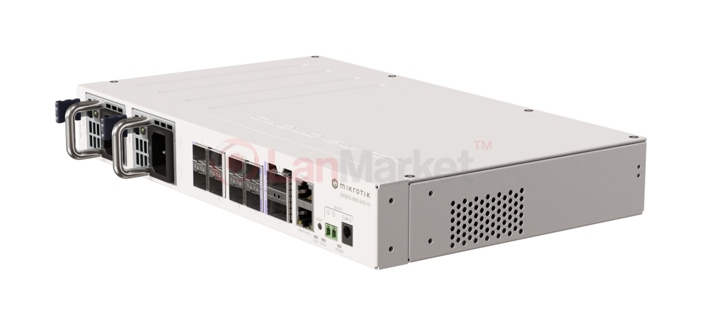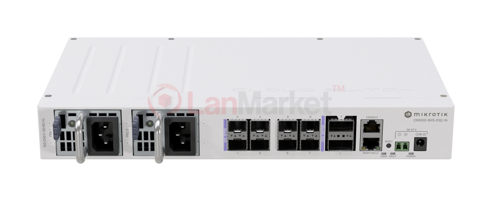 CRS510-8XS-2XQ-IN має подвійні джерела живлення з можливістю гарячої заміни та три варіанти живлення: вхід PoE, роз’єм постійного струму та 2-контактний термінал.