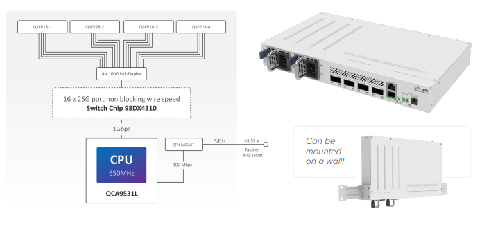 Кожна група з 8 портів Gigabit Ethernet підключена до окремого комутатора-чіпа сімейства Marvell Amethyst. Кожна мікросхема комутатора має повнодуплексну лінію 10 Гбіт/с, підключену до ЦП. Те саме стосується кожного слота SFP+ — окремої повнодуплексної лінії 10 Гбіт/с. Плати поставляються з 4 ГБ оперативної пам'яті DDR4 та 128 МБ пам'яті NAND.