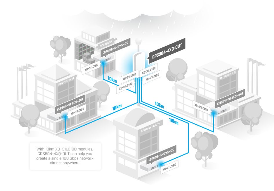 З новими модулями Mikrotik XQ+31LC10D, комутатор CRS504-4XQ-OUT допоможе створити якісну 100 Гбіт/с мережу будь-де. Приклад застосування: