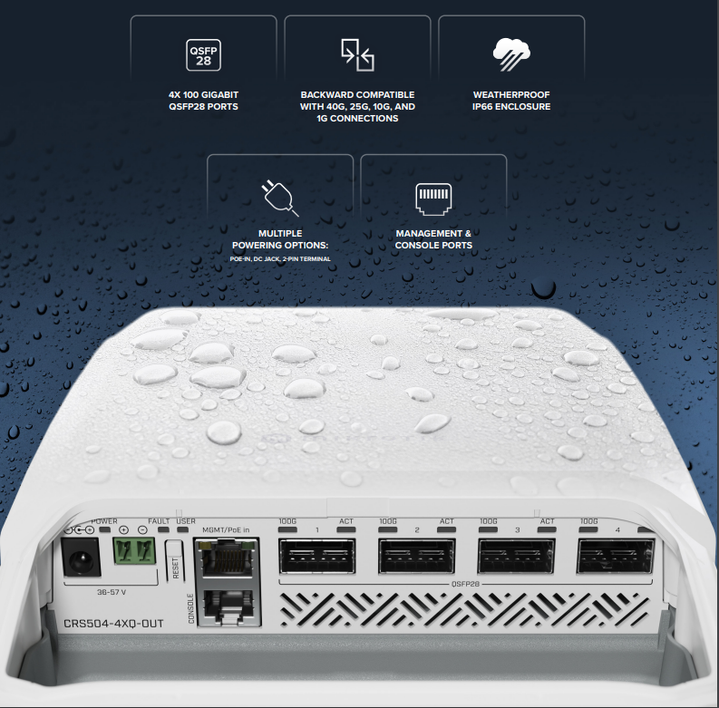 Доступна, компактна, енергоефективна мережа 100 Гбіт/с у будь-який час і в будь-якому місці завдяки новинці CRS504-4XQ-OUT! Наступний крок у модернізації існуючих зовнішніх мереж 10 чи 25 Гігабіт.