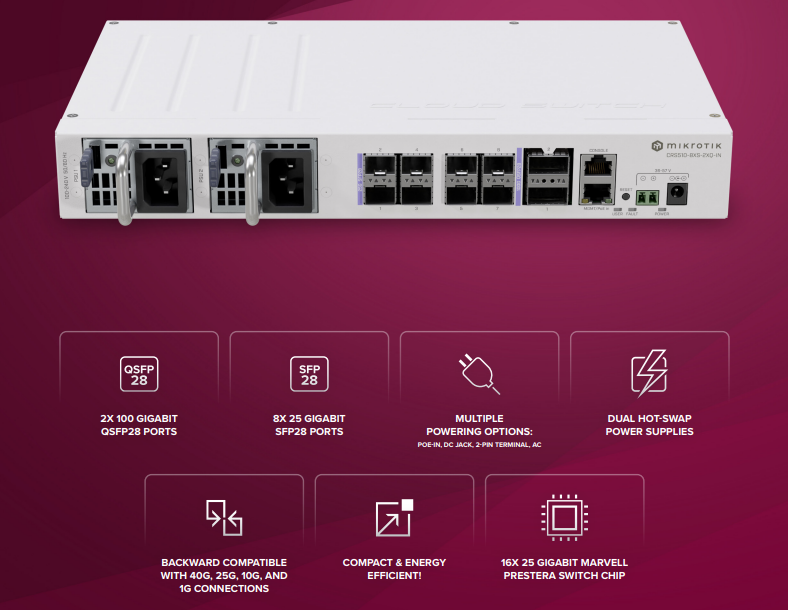 Пам’ятаєте сенсаційні 100-гігабітні комутатори Mikrotik – CRS504 і CRS518? Настав час ще одного приголомшливого доповнення до сімейства продуктів MikroTik 100 Gigabit: універсальний CRS510-8XS-2XQ-IN.