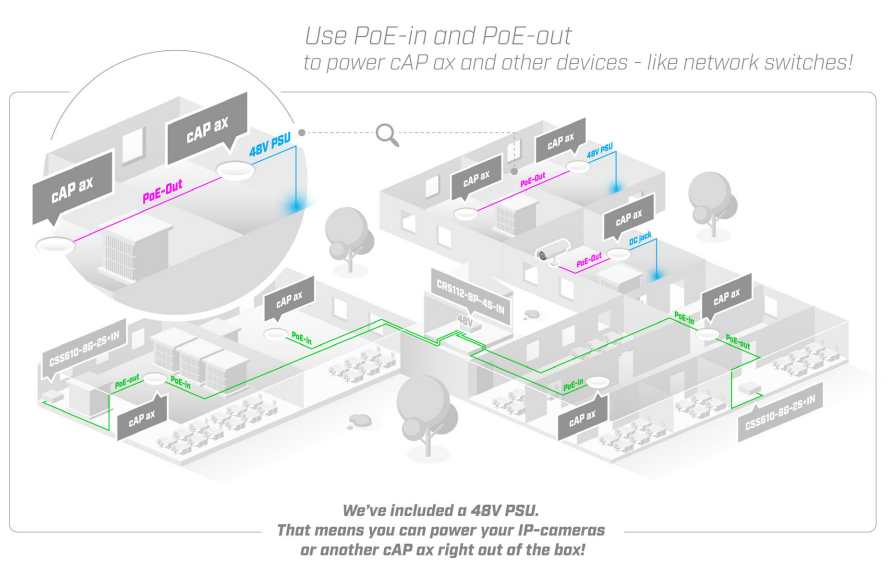cAP ax має 2 1G Ethernet порти з підтримкою PoE-in та PoE-Out (на Ether2 порті). Правильно – ви можете використовувати cAP для живлення інших пристроїв, таких як мережеві комутатори, камери відеоспостереження або навіть іншої точки cAP.