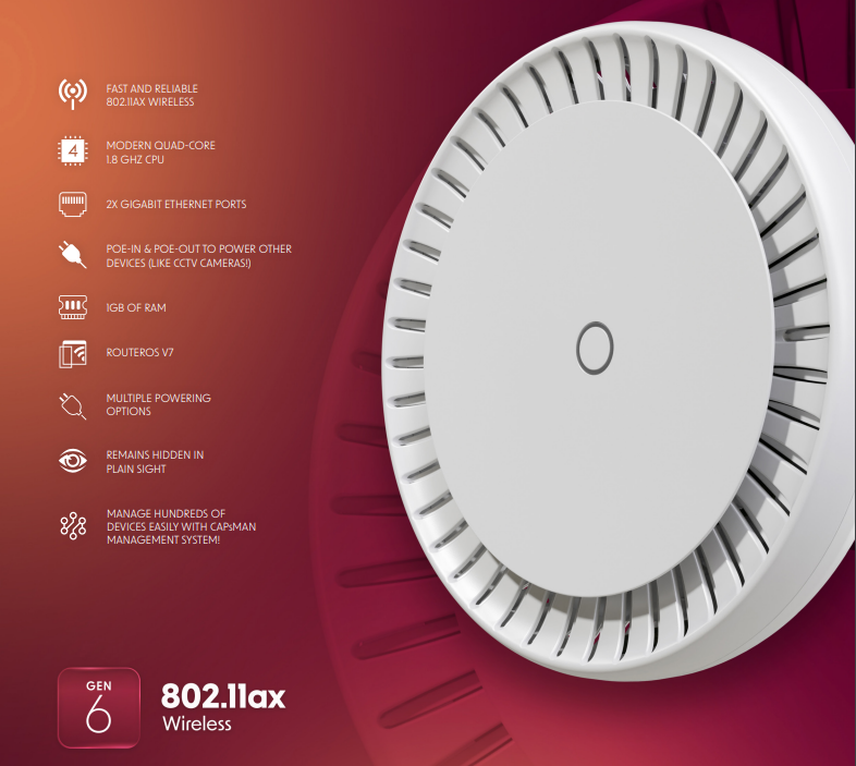Стельове розміщення дозволить запобігти втраті сигналу у великих місцях скупчення людей із великою кількістю перешкод, а підтримка Wi-Fi 6 забезпечить ідеальну продуктивність та стабільність бездротового з'єднання. До того ж порівняно з попереднім поколінням, cAP ax пропонує кілька розширених типів аутентифікації: OWE, WPA3-PSK, WPA3-EAP і роумінг 802.11r.
