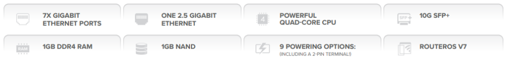 Маршрутизатор заснований на потужному 4-х ядерному процесорі 88F7040 1.4 GHz, має 1 GB оперативної пам'яті типу DDR4 та 1 GB вбудованої NAND пам'яті. Це 9-ти портова модель з 1 портом SFP+, 7 портами 1G Ethernet та 1 портом 2.5G Ethernet. Завдяки останньому RB5009 відмінно підійде для систем з бездротовою мережею Wi-Fi 6 і дозволить отримати максимальну швидкість Wi-Fi з'єднання.