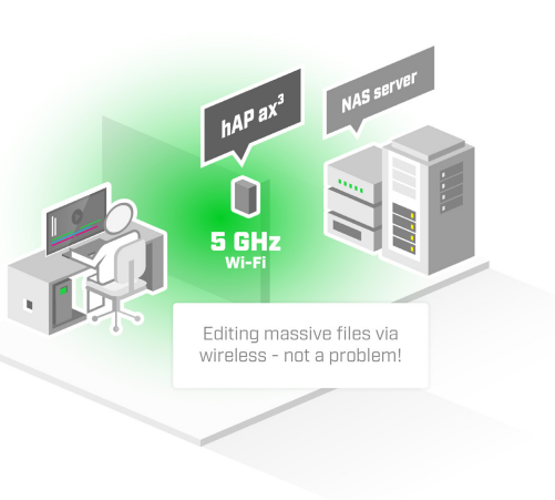 Залежно від ваших загальних налаштувань, сімейство продуктів AX пропонує до 40% вищу швидкість у діапазоні 5 ГГц і до 90% вищу швидкість у діапазоні 2,4 ГГц! Потужні зовнішні антени дозволяють досягти посилення до 5,5 дБі, тому ви можете забути про підсилювачі Wi-Fi та інші хитрощі. Плавне та швидке підключення для всієї квартири – саме так працює hAP ax³.