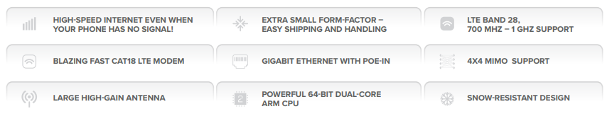 ATL оснащений феноменальним модемом LTE категорії 18 і портом Gigabit Ethernet із входом PoE. У поєднанні з сучасним процесором ARM це означає швидкість до 1 Гбіт/с, відсутність вузьких місць!