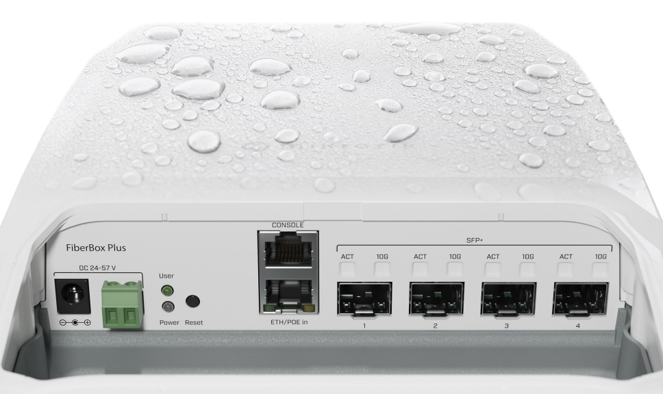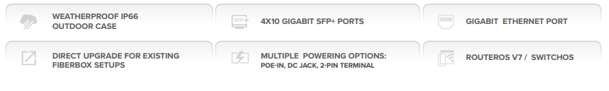 З одного боку Fiber Box Plus - це масштабне оновлення попередніх пристроїв FiberBox. Ця версія має сучасний процесор ARM, більше оперативної пам’яті та чотири 10-гігабітні порти SFP+. Швидке та надійне підключення за бюджетом. Без обмежень відстані Ethernet. Також є порт Gigabit Ethernet для цілей управління або живлення PoE, 2-контактний термінал і стандартне гніздо постійного струму, що забезпечує 3 різні варіанти живлення на вибір. FiberBox Plus підтримує широкий діапазон вхідної напруги 24-57 В. І він надзвичайно ефективний: максимальне споживання електроенергії становить лише 7 Вт!
