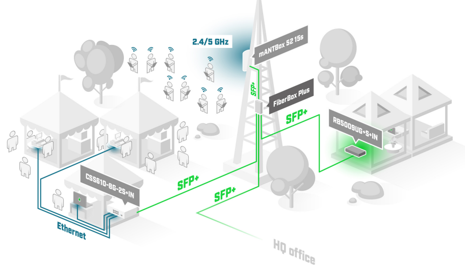 Цей міцний зовнішній комутатор ідеально підходить для підключення щоглових пристроїв таких як mANTBox 52 або LHG XL 52. Уявіть собі величезний кемпінг із кількома гостьовими будинками, фуд-кортом і каютою власника. Ви можете з’єднати всі місця за допомогою FiberBox Plus. Одне з оптоволоконних з’єднань можна використовувати для базової станції mANTBox – для забезпечення загального зв’язку для гостей. Інше з’єднання могло йти до будинку власника. А третій можна було б використовувати у фудкорті – підключити свої платіжні та інвентарні сервери.