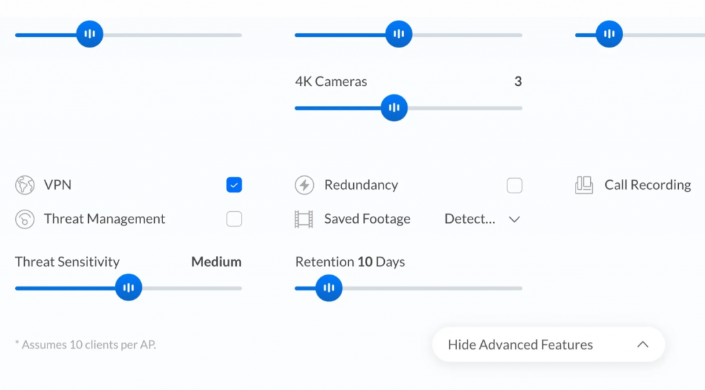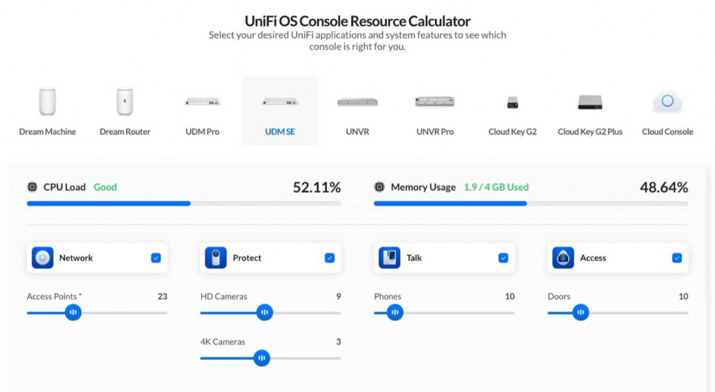 Для полегшення роботи компанія представила UniFi OS Console Resource Calculator : абсолютно новий режим, який не тільки забезпечує обробку консолі та обмеження пам'яті одним клацанням миші, але й дає динамічні наближення того, наскільки добре шкірна консоль може підтримувати різні типи розгортання.