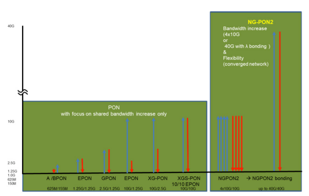 Це призвело до кількох різних реалізацій PON за останні роки, причому останні стандарти PON забезпечують пропускну здатність спільно використовуваної смуги пропускання 10 Гбіт/с / 10 Гбіт/с симетрично. На малюнку 2 показано, як розвивався стандарт PON з першого випуску.