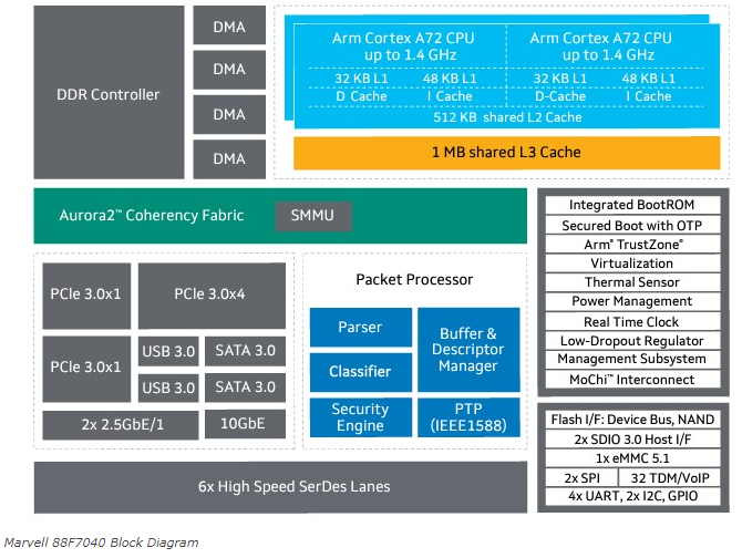 Насправді це досить потужна платформа. Marvell 88F7040 — це чотирьохядерний чіп Arm Cortex-A72.