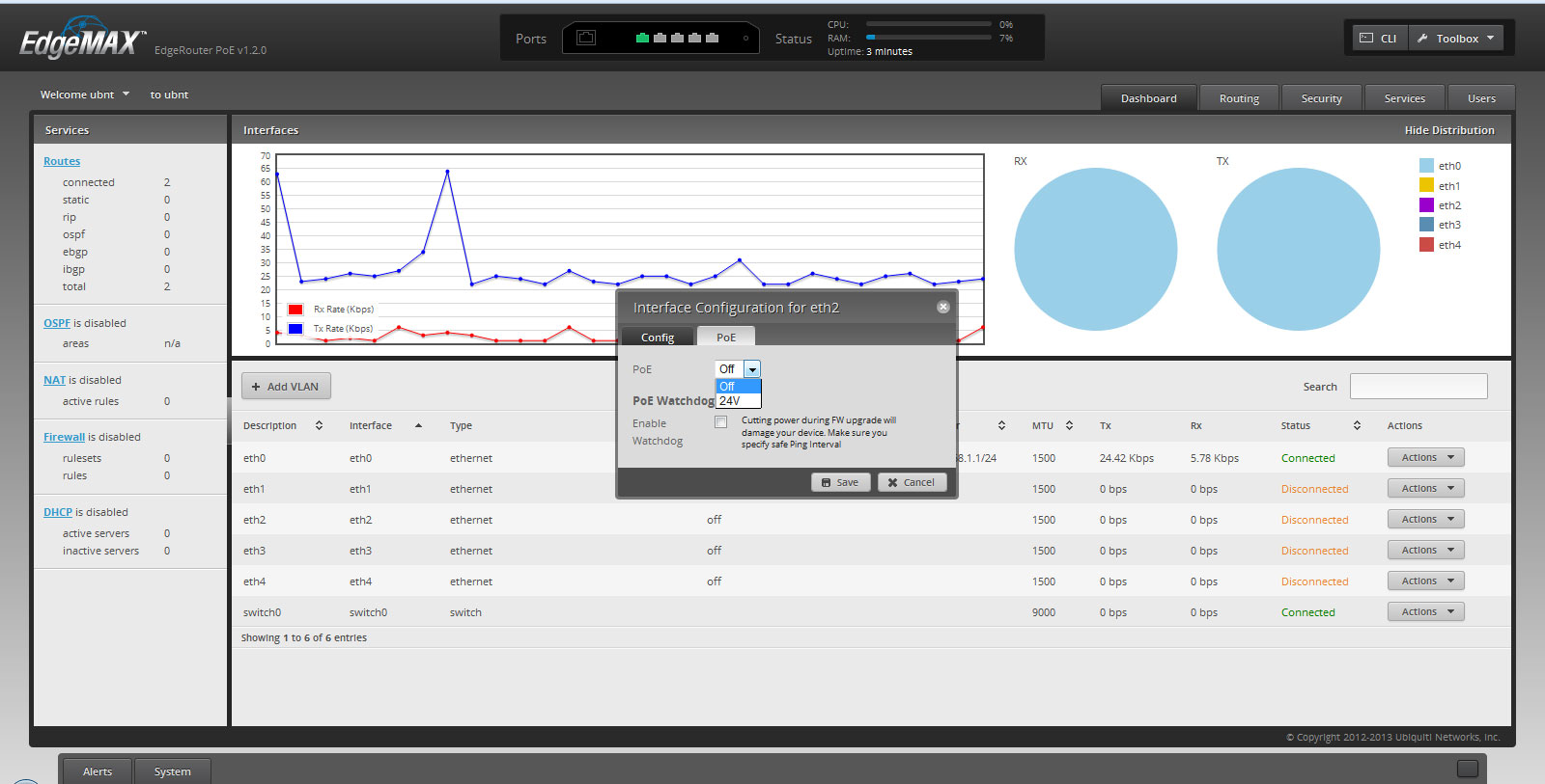 Єдине, в комплекті з Ubiquiti EdgeRouter PoE, постачається блок живлення 24V – 2.5A, що не дозволяє використовувати режим живлення 48V.