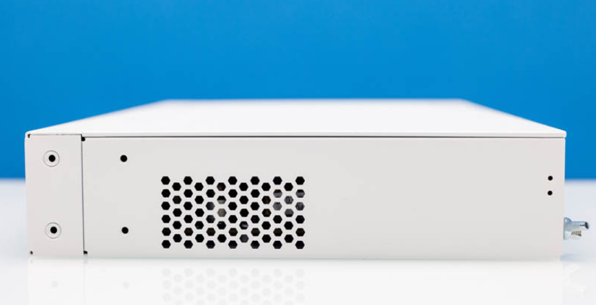 Одна сторона світча є просто металевою, а інша має невеликий вентиляційний отвір. З цього боку також видно монтажні отвори для вушок стійки. Всього комутатор має 2 вентилятори для охолодження, але при цьому залишається не дуже гучним.