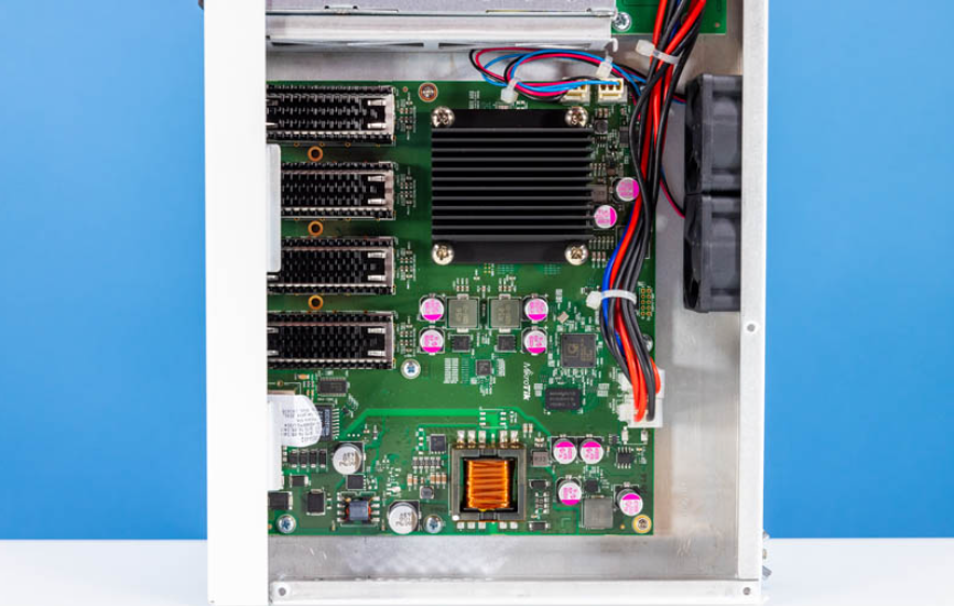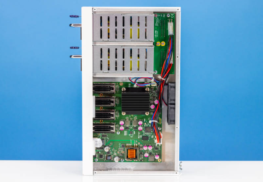 Ось як виглядає комутатор з блоком живлення вгорі, потім чіпами Marvell і Qualcomm і портами 100GbE внизу.