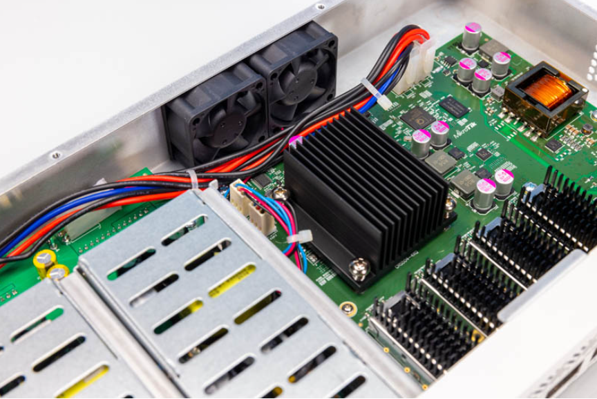 Мікросхема Prestera знаходиться під більшим радіатором. Що стосується радіаторів, то слоти QSFP28 мають величезні радіатори для охолодження оптичних модулів. Приблизно половина енергоспоживання в CRS504 припадає на модулі QSFP28.