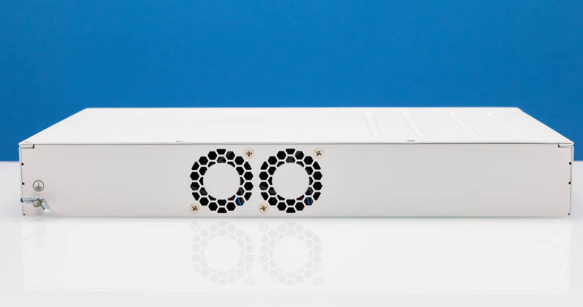 Причина, по якій задня частина комутатора така проста і на якій є тільки гайка заземлення, полягає в тому, що пристрій розроблено для щільних стелажів з обладнанням. Багато мають доступ до кабелю лише спереду. У результаті всі кабелі живлення та даних знаходяться на передній частині корпусу.