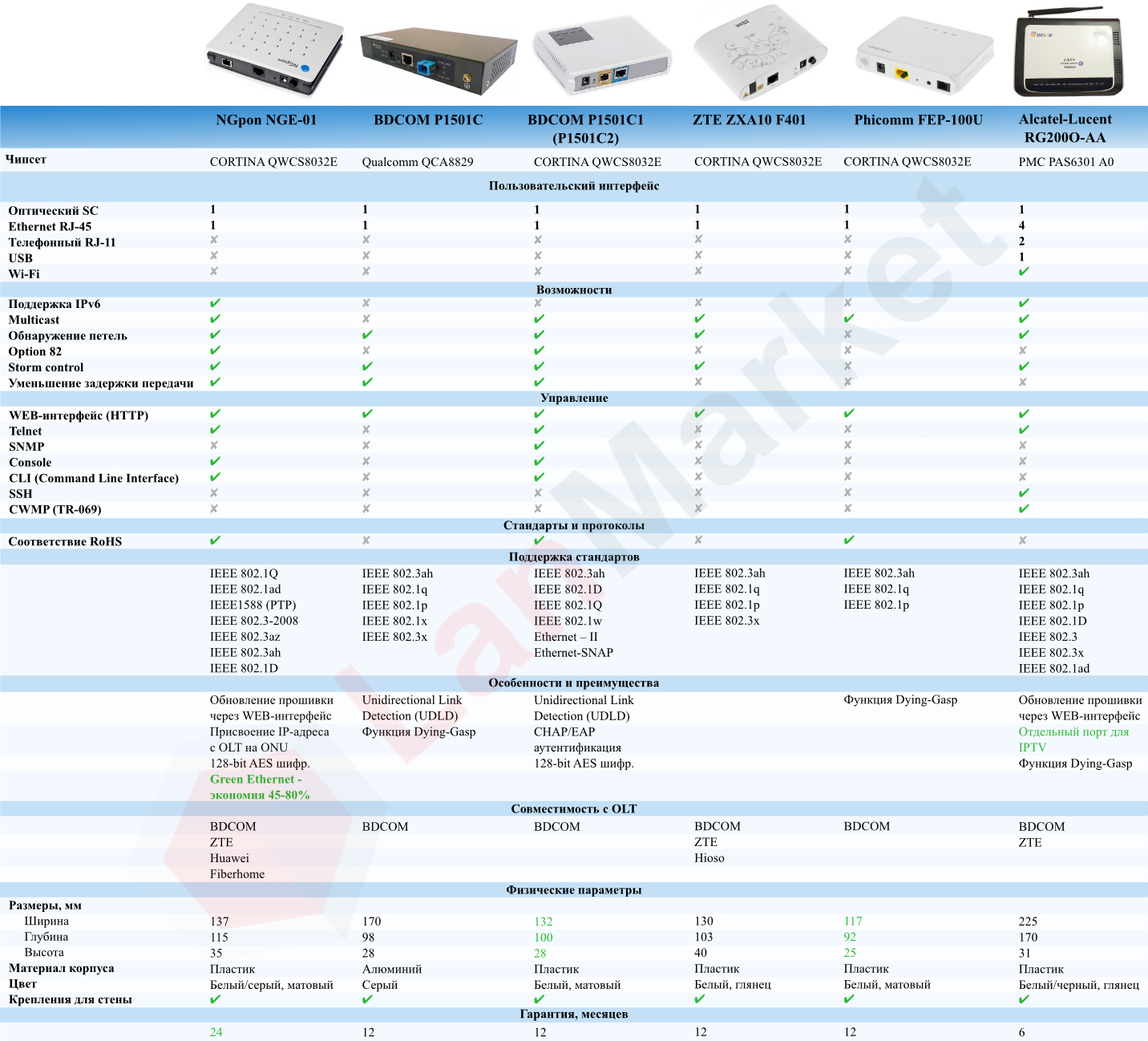 На прохання клієнтів компанія Ланмаркет публікує таблицю порівняння характеристик шести найпопулярніших оптичних абонентських терміналів, які представлені в нашому інтернет-магазині.